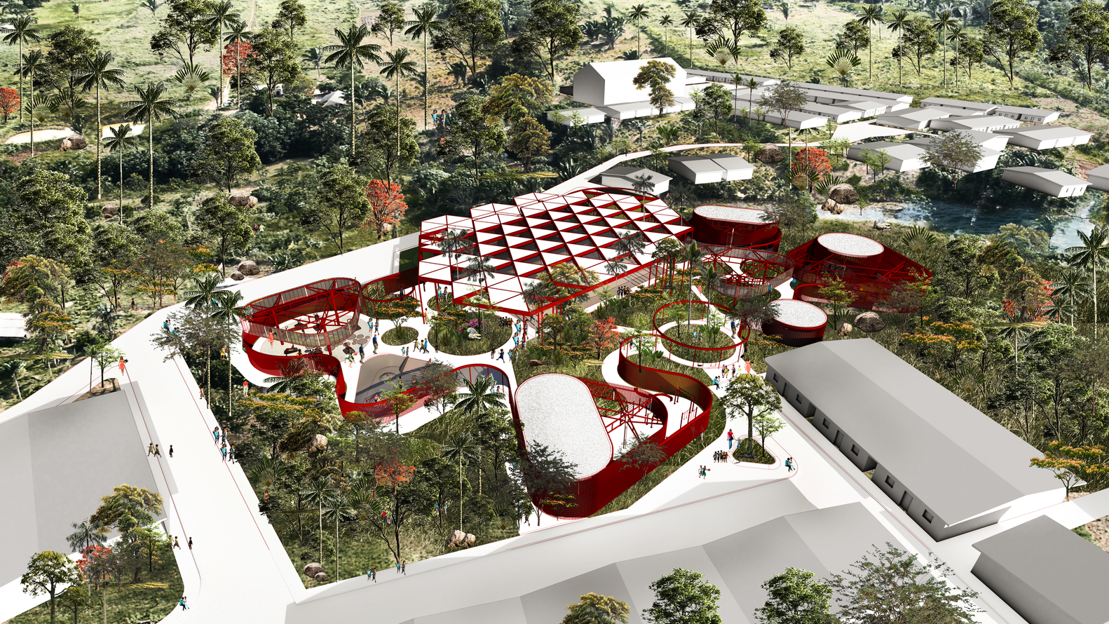 La propuesta simula tres escenarios de la geografía colombiana: Ciénaga, Magdalena (Región Caribe), Mocoa, Putumayo (Región Amazónica) y Bogotá D.C (Región Andina). El diseño entiende el Prototipo como un equipamiento comunitario de características polifuncionales, replicable y sostenible, que genere apropiación en los contextos donde se implanta. Constructivamente, se plantea como una estructura aporticada revestida por una envolvente que responde climáticamente a las diversas condiciones del territorio colombiano.