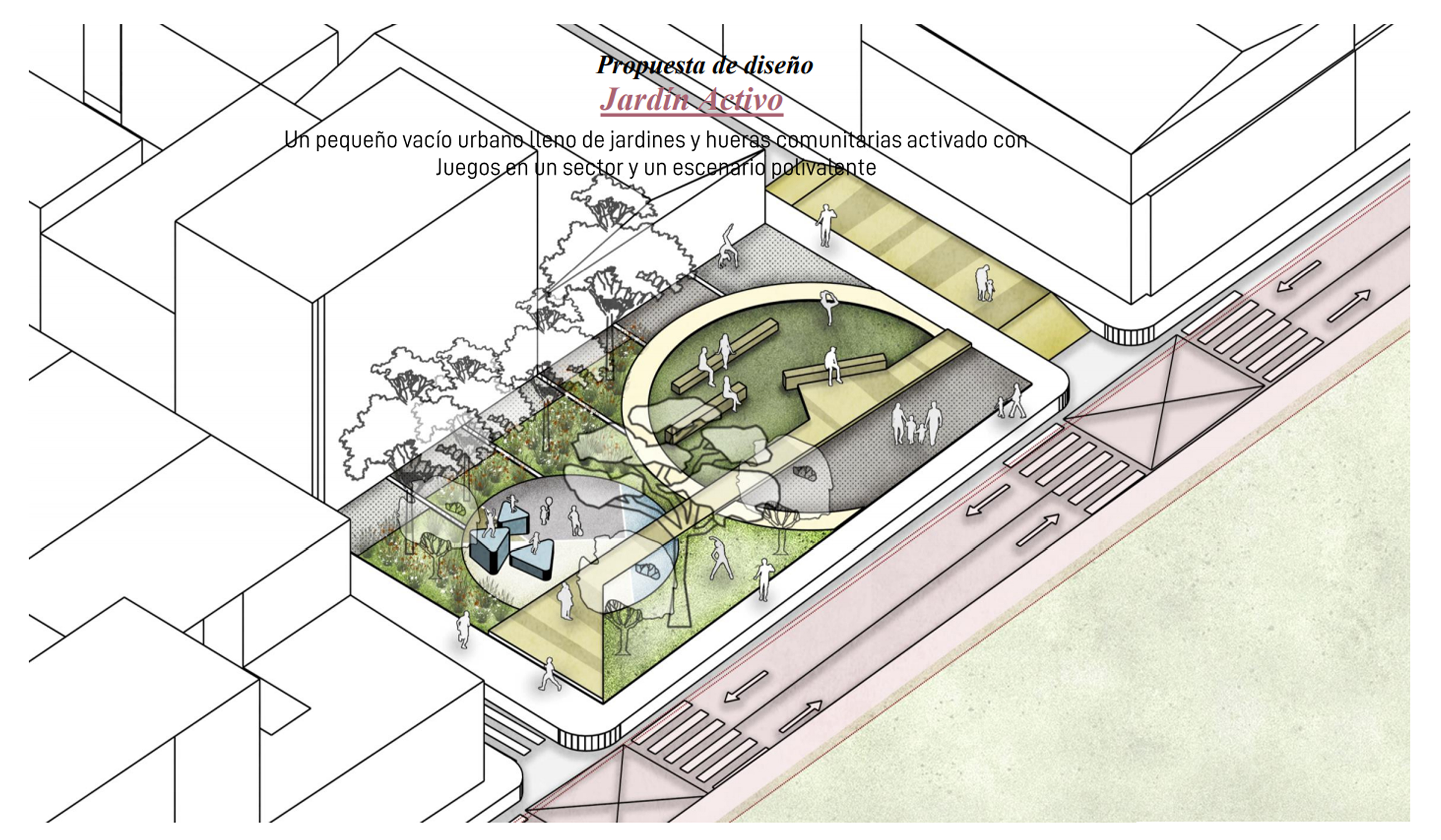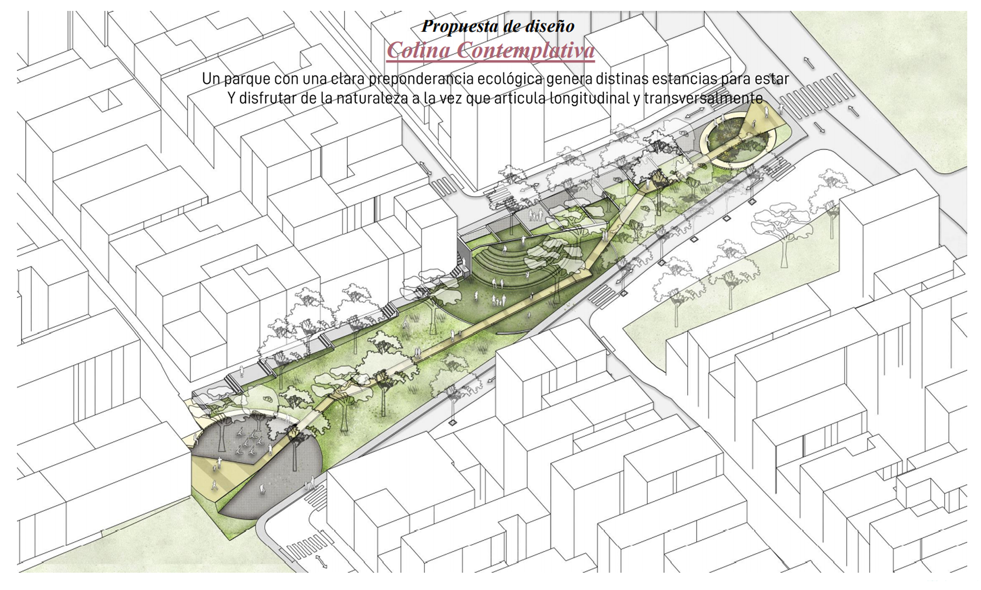 - Los barrios como escenarios ricos en historias, habilidades y oficios, necesitan de un espacio para su reconocimiento. Se plantea un elemento estructurador del espacio público que articule y enlace las diferentes actividades y condiciones urbanas, con un recorrido compuesto por pabellones flexibles, líneas históricas del barrio, plazas de arte y de contemplación que permitan evidenciar sus narrativas ocultas