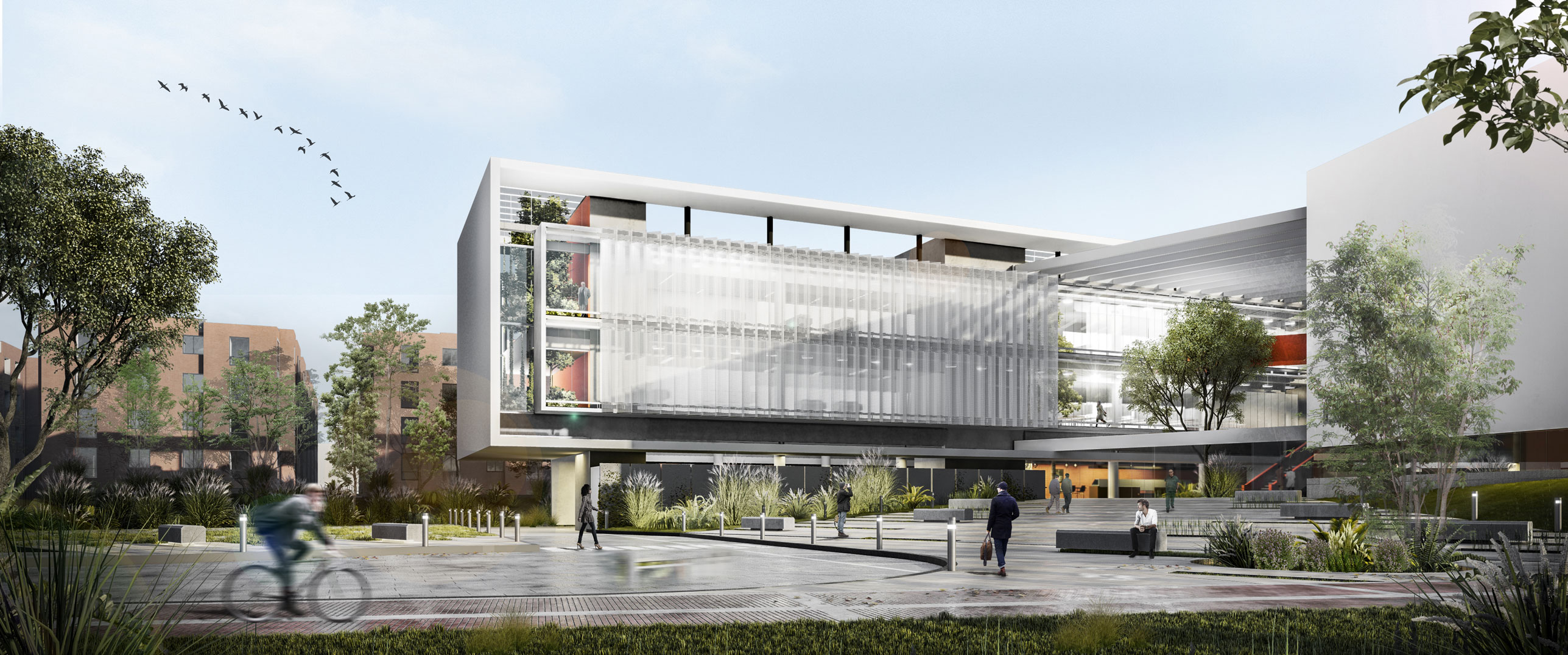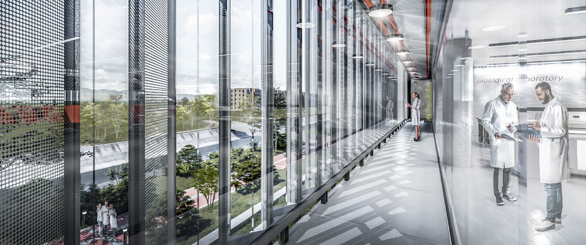 Se trata de facilitar la permeabilidad de las calidades ecológicas que puede brindar el canal (Rio) San Francisco y el parque lineal que lo acompaña, llevando estas condiciones al interior del predio a través de un corredor vegetal-peatonal como columna vertebral del conjunto, el cual conecta las actividades dispersas de los nuevos edificios con los existentes. Para intensificar esta condición se divide el paquete funcional de los laboratorios en dos edificios, los Laboratorios Húmedos miran hacia el Rio San Francisco y los Laboratorios Secos se dirigen hacia el jarillón del parque lineal residencial, creando entre los edificios un acceso digno al nuevo “campus” y un espacio que potencie la vida colectiva a través del encuentro extra-laboral. Dentro de cada edificio, los vacíos verdes crean “pausas” en las condiciones asépticas del arquetipo de un laboratorio técnico, al tiempo, los interiores se relacionan con el contexto a través de dobles fachadas permeables que permiten el paso de redes técnicas junto con ventilación natural y visuales abiertas, mejorando la cotidianidad de los laboratoristas.