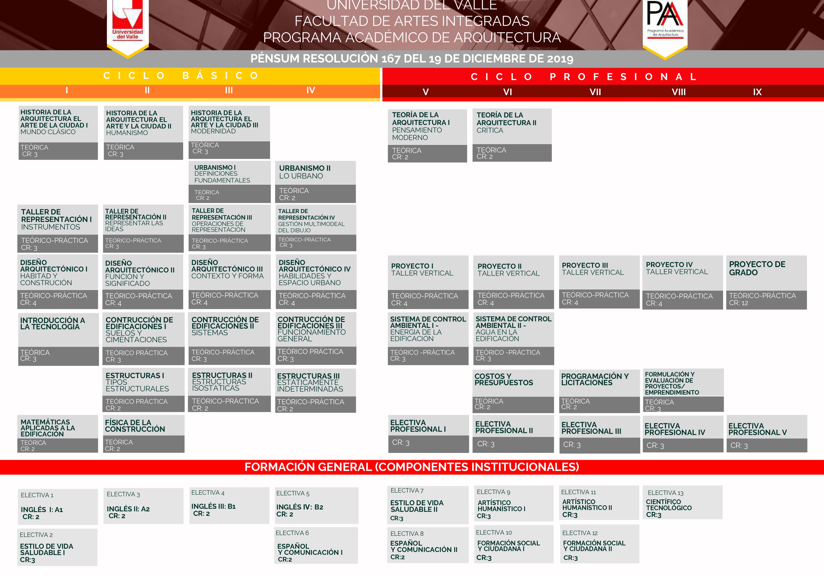 La Estructura curricular del Programa de Arquitectura se configura por medio de dos ámbitos formativos; el primero de carácter eminentemente disciplinar e instrumental que permite que los estudiantes adquieran los conocimientos fundamentales de la disciplina y desarrollen las competencias básicas, allí la disciplina está claramente organizada de manera analítica por saberes específicos. El otro con un grupo de conocimientos más integrados que le permiten a los estudiantes ampliar su base formativa, puesto que desarrolla procesos pedagógicos con conocimientos aplicados y se complementa con materias electivas en dos modalidades: profesionales (objetos de estudio propios de la disciplina) y complementarias.